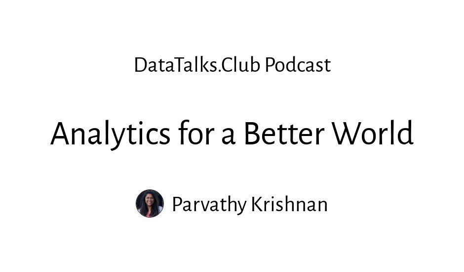 Alexey: This week, we'll talk about improving our world with analytics. We have a special guest today, Parvathy. Parvathy is a CTO at Analytics for a Better World, a nonprofit organization aiming to use analytic techniques to contribute to sustainable development goals. She holds a professional doctorate degree in data science from Eindhoven University of Technology. Welcome. (1:10)