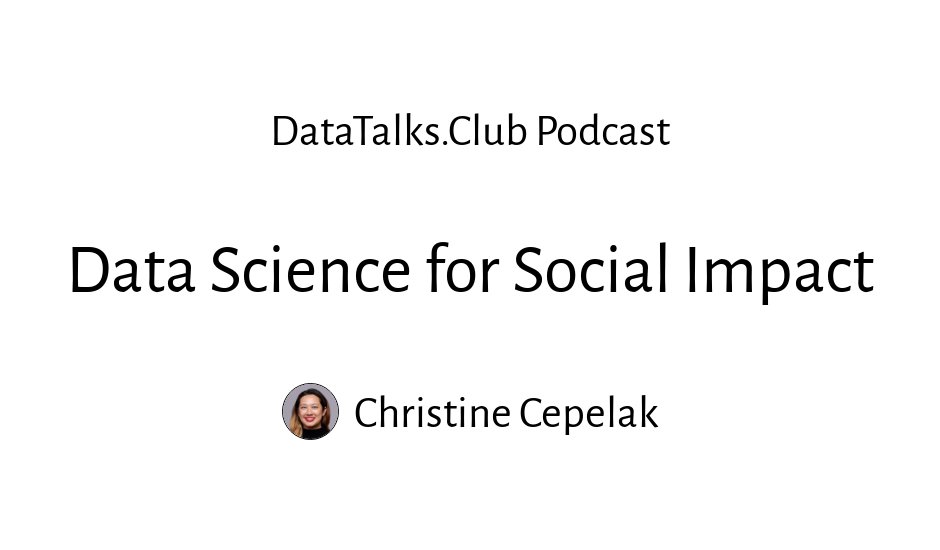 Alexey: This week, we'll talk about data science for social impact. We have a special guest today, Christine. Christine is a writer and researcher of tech and social issues. She is currently studying data science for public policy, and previously, she spent years managing social programs and exploring Data Science for Social Good. Welcome, Christine. (0.0)