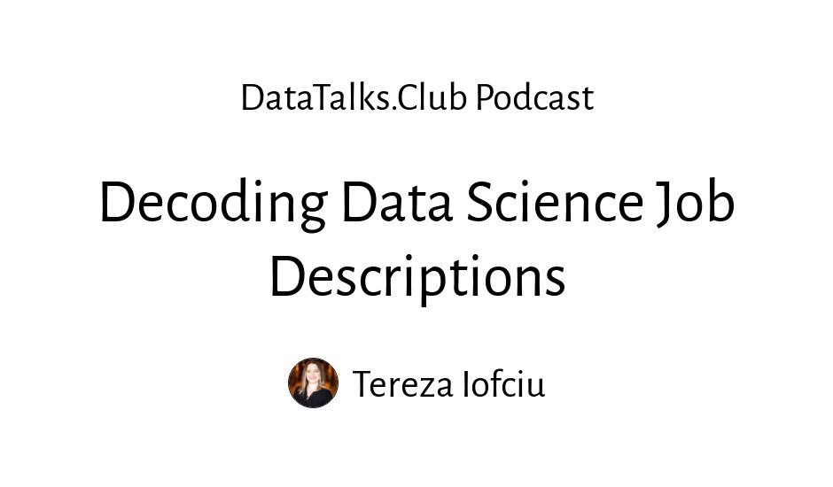 Tereza: If you are applying as a data scientist and they ask you all sorts of tools, like all the tools, all over the space of data, then you already know that you're not really gonna do data science. [laughs] Basically, on the checklist, on the team side, I would say to figure out if there's a team mentioned. How is that team mentioned? What do they say about the team? One thing that is also borderline with culture here is – do they have juniors in the team or not? Maybe they don't have juniors in this team, but they have juniors in other teams. This is taking it to the culture level. (27:18)