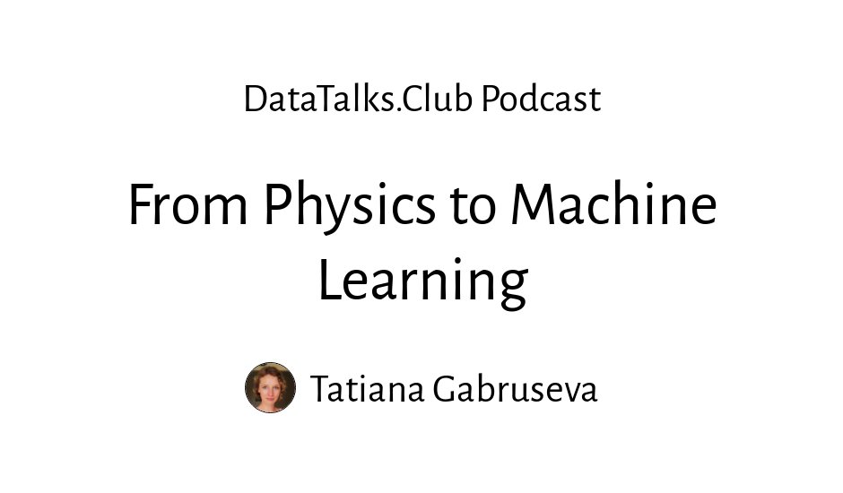 Alexey: This week we will talk about switching careers from physics to doing machine learning. We have special guests today — Tatiana. Tatiana is a computer vision deep learning engineer. She is a Kaggle competition master and she currently works as a senior machine learning engineer at Cork University Hospital. Welcome Tatiana. (1:57)