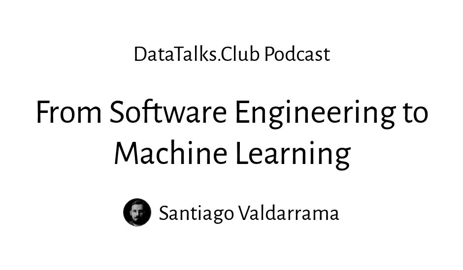Alexey: Today we'll talk about career transitioning from software engineering to machine learning. We have a special guest today, Santiago. Santiago is a director of computer vision solutions at Levitas. There, he leads a small team of software engineers and machine learning engineers. Santiago is a computer scientist who focuses on applied machine learning. You probably know Santiago from his Twitter. On Twitter, every day, he shares a lot of practical things about machine learning. Thanks, Santiago, for joining us today. Welcome. (2:39)