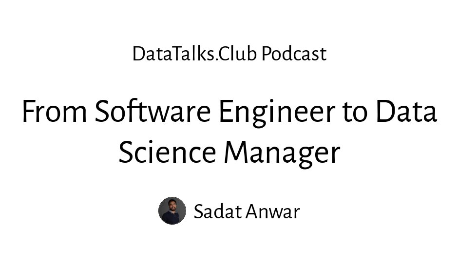 Alexey: This week, we'll talk about changing careers from software engineering to data science management. We have a special guest today, Sadat. Sadat and I are colleagues – we both work at OLX Group. He joined OLX as a software engineer, and then he got promoted to an engineering manager. And finally he decided to change his career and switch to data science management. I invited Sadat to talk more about his career transitioning. Welcome. (1:05)