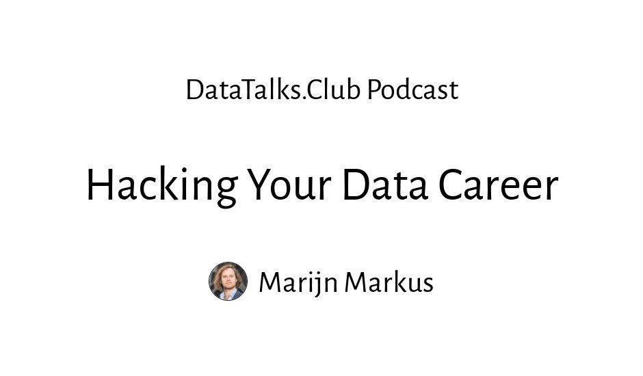 Alexey: Okay. [laughs] I came across your post on LinkedIn. I reached out to you multiple times inviting you for the podcast. Then I saw this post, and I thought, "Okay. This is what I want to talk to Marijn about." And the post was about "how to hack your career" and this is actually the name of the event we have. (12:05)