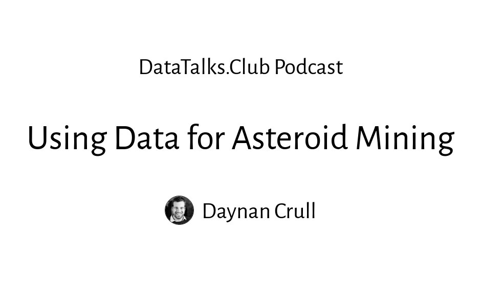 Alexey: This week, we'll talk about extracting space resources from asteroids. We have a special guest today, Daynan. Daynan and his co-founders created Karman+ to mine near-Earth asteroids. Previously, he worked as a data scientist, so I thought it would be a great idea to invite him to talk about applications of data science for mining asteroids, specifically and for astronomy in general. Welcome. (1:23)