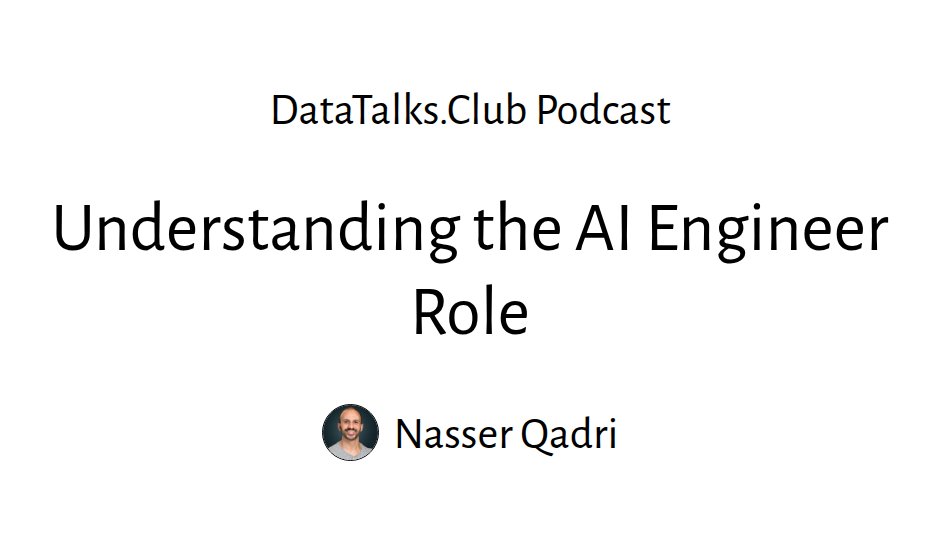 Alexey: This week we will talk about the AI engineer role. I am quite interested in this role. Lately, you may have noticed that we are putting out more content about this and I want to talk about this role today with our guest Nasser. (15.0)