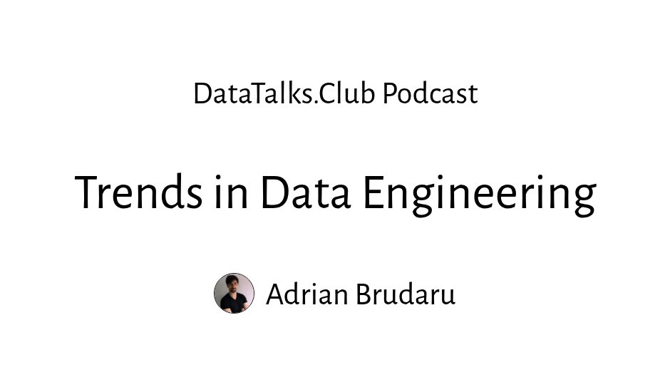 Alexey: This week, we’ll talk about trends in data engineering. Our special guest today is Adrian, a returning guest. This is his third time on the podcast, but he’s also been part of workshops and open-source demos. Many of you probably know him already. (1.0)